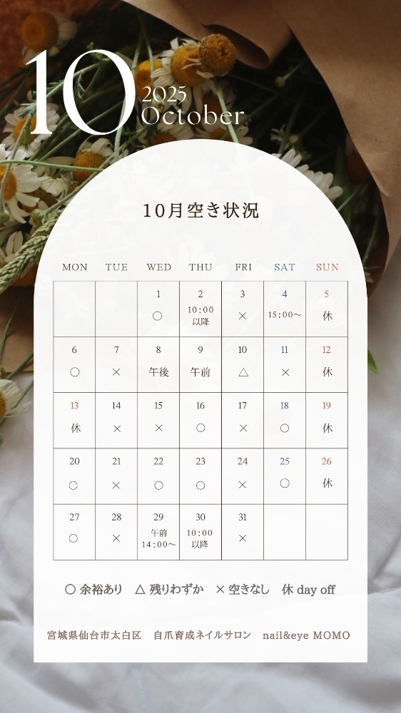 只今の空き情報です🧸🍃予約状況は、変動がございますのでお気軽にご相談くださいませ🍑一気に涼しくなり、秋めいてまいりました🌰✨体調崩さぬよう、お気を付けください🥺仙台でネイルの自爪育成や深爪矯正、深爪治し方までサポートし、自然に見える自爪風ネイルやネイルケアができるサロンとして、多くの方にご利用いただいている nail&eye MOMO で、健やかで美しい爪を一緒に叶えましょう💅✨